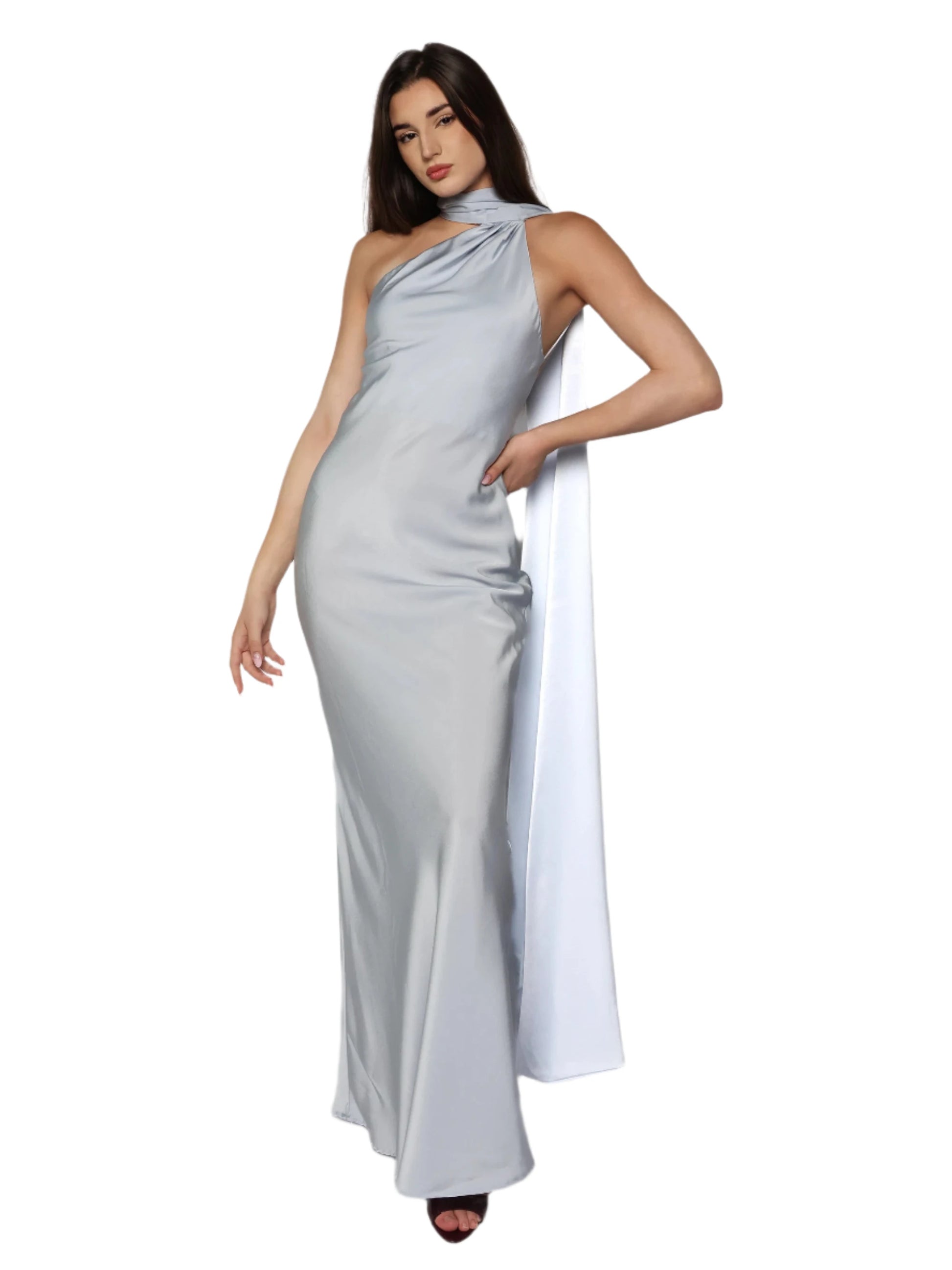 Rochie lunga satinata cu detaliu tip esarfa fluida, Alma
